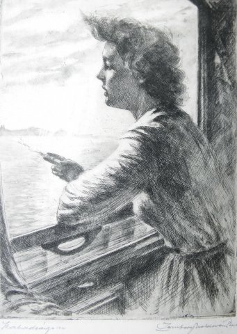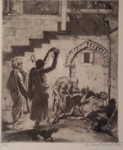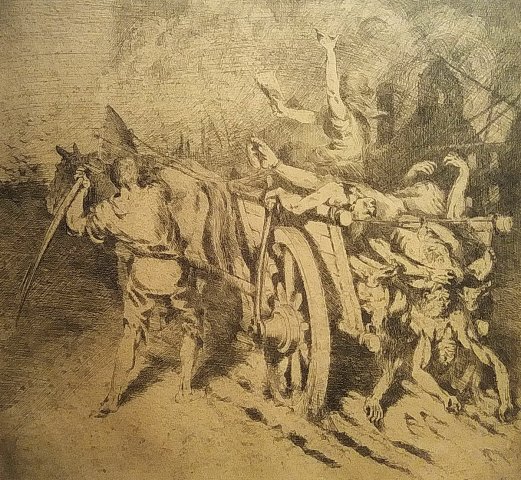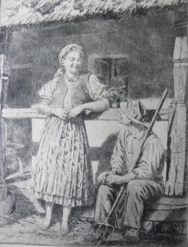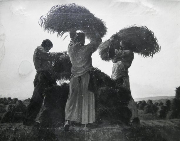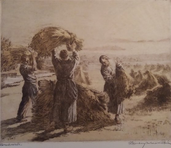 Keresztrakók / Making a stook (színezett rézkarc, 1950-es évek / etching, water-colour, 1950s)