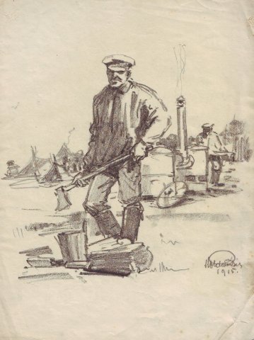 Orosz hadifogoly tüzelőt hasít a gulyáságyúhoz (Kissitke, orosz hadifogolytábor, 1915) / Russian POW splitting firewood for a field kitchen (Kissitke, Hungary, Russian POW camp, 1915)